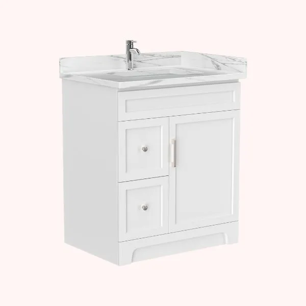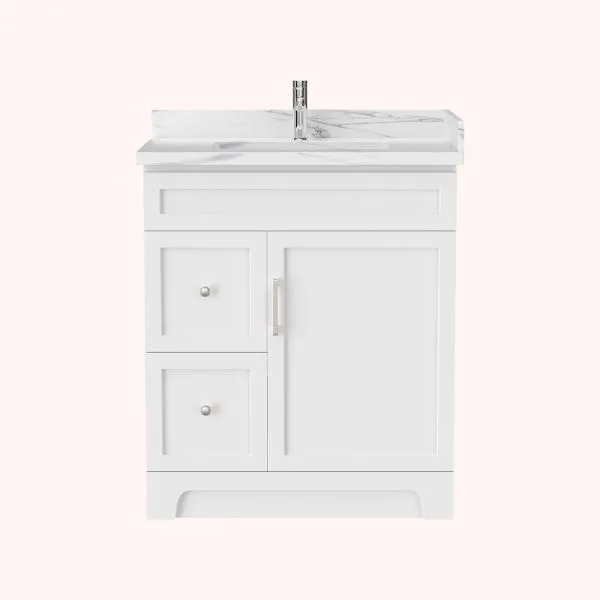 -2 drawers on the left & 1 door on the right. DTC soft-closing hinges&sliders. -No faucet/popup/handle